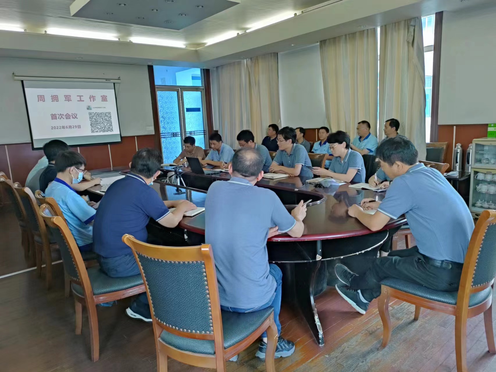 6月29日下午,0638太阳集团官网在306会议室召开了“周拥军工作室”成立后的首次会议。会议由集团公司副总经理陈建主持,集团公司总经理包卫东、综合管理部负责人及设备主管、各生产车间主任及络筒设备技术员等二十多人参加了会议。