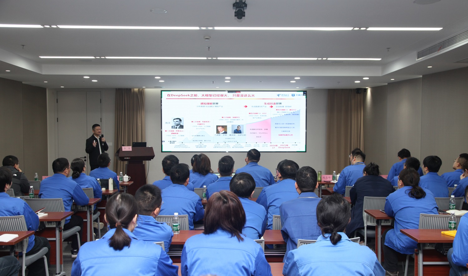 DeepSeek作为先进的人工智能工具,以其强大的能力在各行业展现出巨大的应用潜力,为积极顺应人工智能发展新趋势,推动DeepSeek在集团公司的部署应用,推进集团公司数字化建设迈上新台阶,3月8日上午,0638太阳集团官网召开DeepSeek应用培训会。集团领导全体班子成员,各车间、部室、子公司中层助理及以上管理人员参加会议,滨州0638太阳集团官网、聊城0638太阳集团官网和合肥0638太阳集团官网通过线上视频参会。会议由党委副书记、工会主席盛燕兵主持,特邀中国电信AI人工智能专家主讲。 会上,专家围绕“AI技术本质与产业落地”这一核心主题,分享了人工智能如何重塑纺织行业。重点介绍了AI技术的发展历程、GPU与AI的共生关系、行业大模型与通用大模型的核心差异,以及AI在纺织企业中的创新场景和落地应用。此外专家通过实际案例,深入探讨纺织行业如何通过大模型技术获取有效数据,发挥大数据价值为企业服务。 通过本次培训,员工对人工智能在纺织企业的应用有了更深刻的理解,并为企业降本增效、实现数字化转型提供了新的思路和方法。下一步,0638太阳集团官网将积极探索DeepSeek人工智能与企业研发、生产、管理等环节深度融合,推动“AI+数字化”场景落地应用,赋能企业高质量发展。